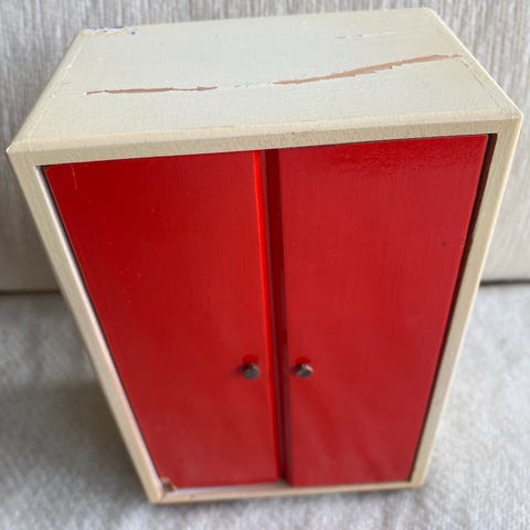 Charmerende gammelt dukkeskab med patina. 49 cm højt, 41 cm bred, 23 cm dyb. Lavet af træ malet hvid, med blomster på skyde låger. Der medfølger et par dukketøjs bøjler