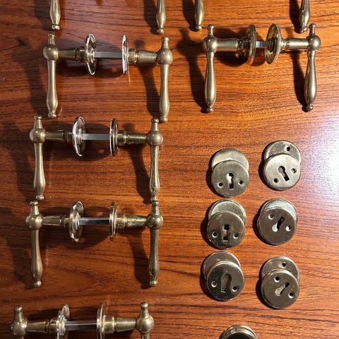 Messing dørhåndtag sæt med håndtag på 12 cm i længden. Materialet er messing og sættet inkluderer to håndtag med tilhørende monteringsdele. Virkelig god kvalitet kan sendes med GLS