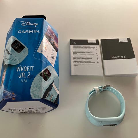 Garmin Vivofit Jr. børneur med sort rem. Uret er designet til børn og har funktioner til aktivitetsmåling og tidstagning.