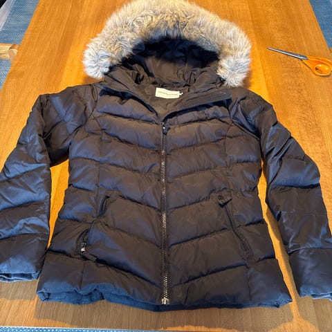 Super flot Calvin Klein Jeans Andet udendørstøj til kvinder i størrelse S. Jakken er hvid og belge lavet af dunmateriale, hvilket giver isolering og varme. Designet til udendørs brug med fokus på funktionalitet og komfort.