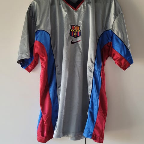 Nike FC Barcelona fodboldtrøje i størrelse L. Trøjen er fra 08/09 sæsonen. El Cant del Barca er desværre røget af i vask i nakken, men ellers står trøjen ret skarp for sin alder.