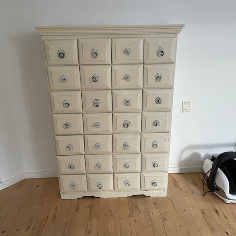 Har lidt brugsspor i form af en lille rød klat og lidt rester af labels på skufferne.