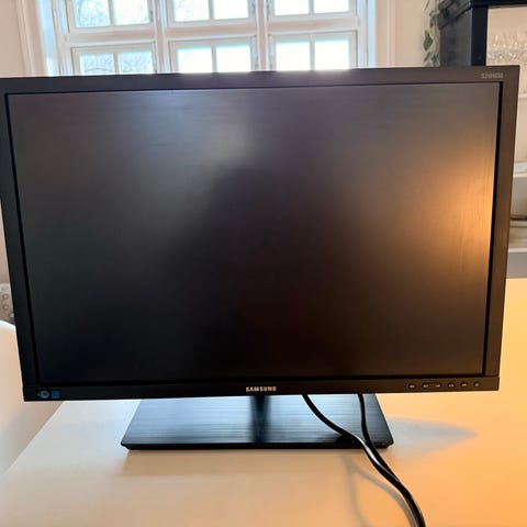 Solid og ergonomisk 24-tommer computerskærm fra Samsung. Modellen er en S24C650DW, som er en professionel kontorskærm kendt for god billedkvalitet og mange indstillingsmuligheder.