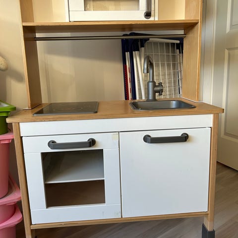 IKEA børnekøkken i træ med hvidt kabinet og naturfarvet bordplade. Køkkenet har en indbygget vask med hane, ovn med gennemsigtigt dørvindue samt opbevaringsplads bag låger. Velegnet til leg og læring i hjemmet eller institution.