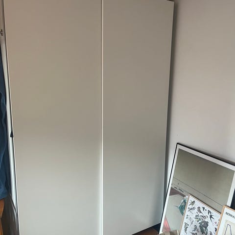 Godt og rummeligt garderobeskab af 2 stk pax 1 m brede moduler med hvide skydelåger, 2 hylder og 2 garderobestænger. Slid i toppen på den ene låge (kan males). Køber skal selv skille skabet ad.