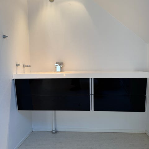 JKEdesign - sort badeværelsesskab med terrazzo vask og skuffer