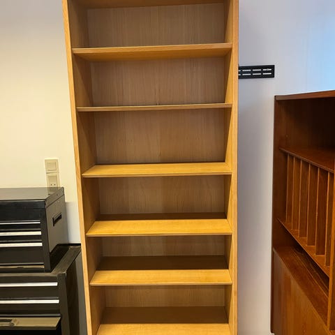 3 stk reoler i egetræ. To af dem er ens, den sidste har anden rumdeling. Uden ben, de står blot på et stativ (kan medkøbes). Kan købes samlet til 2000 kr eller hver for sig til 800 kr.