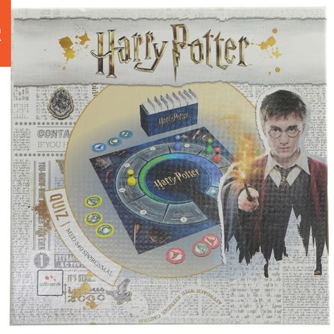 Harry Potter Quiz brætspil med spilleplade, kort, spillebrikker og instruktionsmanual. Spillet indeholder forskellige quizspørgsmål relateret til Harry Potter-universet og er designet til flere spillere.