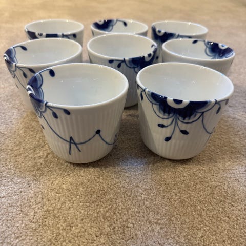 Royal Copenhagen Blå Mega kopper, 6 stk. Kopperne er dekoreret med det karakteristiske blå blomster- og bladmotiv på hvidt porcelæn. De er egnet til servering af varme drikke og passer til brug i køkken og spisestue.