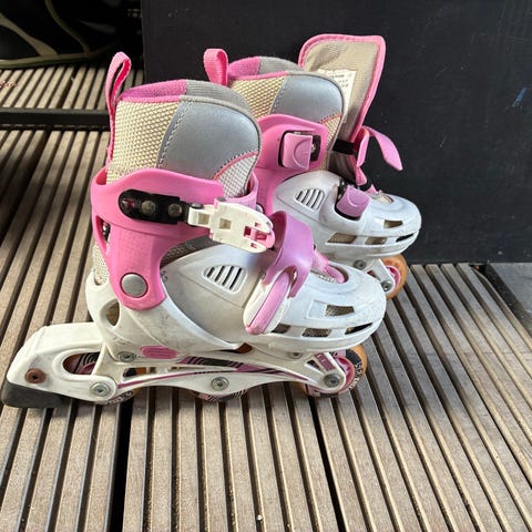 Et par børnerulleskøjter med justerbar størrelse fra 29 til 33. De er primært lyserøde med sorte elementer og stjerne-mønstre. Skøjterne er udstyret med fire gummihjul og spænder til at sikre en tæt pasform.
