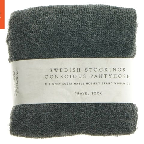 Disse grå sokker er fra mærket Swedish Stockings, kendt som et bevidst og bæredygtigt undertøjsmærke. Sokken er et produkt designet til rejser, og de er pakket med et bånd om dem, der beskriver mærkets vision om at ændre og påvirke hele strømpeindustrien. Sokken ser ud til at være komfortabel og i god kvalitet, ideel til lange rejser eller hverdagsbrug.