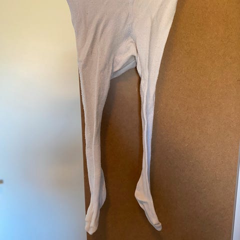 Strømpebukser til børn i en neutral hvid farve. De er lavet af et strækbart materiale, der sikrer god pasform og komfort til brugeren. Der er ingen syninger, der stikker ud på ydersiden, hvilket giver et glat udseende.