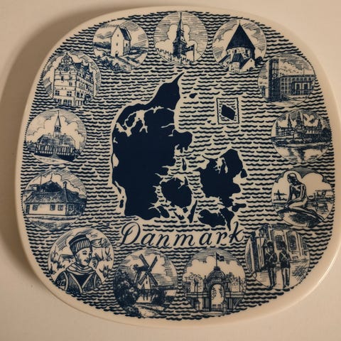 Dette er et sæt af fem blå porcelænsplatter, hver med en diameter på 8 cm. De har forskellige motiver, der repræsenterer ikoniske steder i Danmark såsom Frederiksborg, Rebild Bakker, Amalienborg Slot, Langelinie og Rundetårn. Platterne er mest kendt fra deres dekorative anvendelse, hvor de kan hænges op på væggen eller placeres på en hylde. Bagsiden af hver platte er mærket med 'Denmark' efterfulgt af navnet på stedet og årstallet 2010.