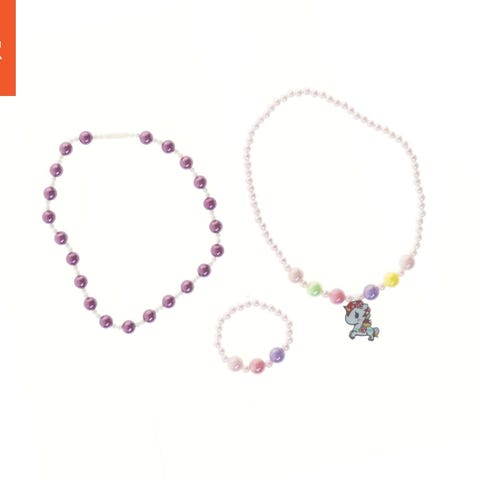 Sæt med tre perlekæder til børn bestående af en halskæde, armbånd og ring. Halskæden er dekoreret med en farverig enhjørning vedhæng og flerfarvede perler. Armbåndet og ringen har ensartede lilla og hvide perler. Ideel til børn, især til leg og udklædning.