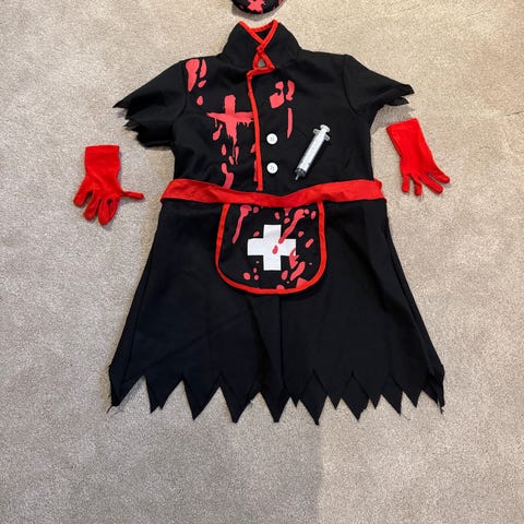 Kostume bestående af en blå kjole med hvide detaljer og et hvidt forklæde med rød kant. Foran på forklædet er et rødt hjerte med et hvidt kors. Til kostumet medfølger en hvid hårbøjle med en sygeplejehat dekoreret med et rødt hjerte og et hvidt kors. Kjolen har puffede korte ærmer med røde manchetter og en lukkemekanisme på ryggen.