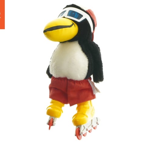 Denne tøjdyrsfigur forestiller en pingvin iført solbriller og en rød hat. Den har rød shorts på og gule plastikrulleskøjter med røde hjul. Figuren er lavet af blødt materiale og er 26 cm høj.