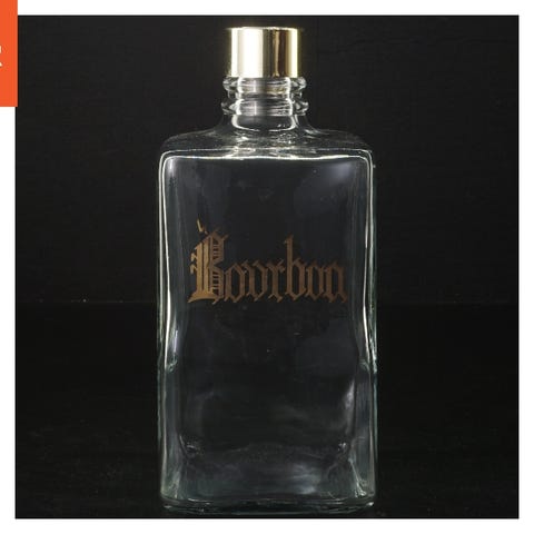 Glasflaske med teksten 'Bourbon' på forsiden. Flasken har en firkantet form med en højde på 20 cm og en åbning i toppen til påfyldning og lukning. Den er klar i farven og har et enkelt, elegant design.