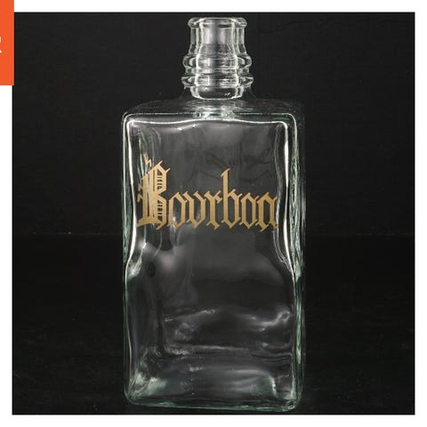 Flaske med ordene 'Bourbon' trykt på forsiden i en gylden farve. Flasken har en rektangulær facon og er lavet af gennemsigtigt glas. Den kommer med et guldfarvet låg, der lukker flasken tæt. Størrelsen er 20 cm i højde. Flasken har en klassisk og elegant udseende, passende til opbevaring af spiritus eller som dekorativt element.