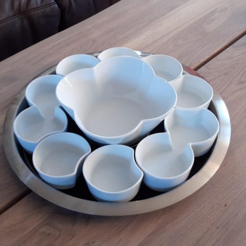 Bodum Tapas Tray tapasfad i hvid. Sættet består af et stort rundt fad med flere små skåle til servering af tapas eller lignende småretter.