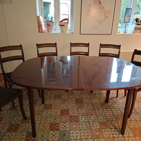 Ole Wanscher design. Dansk klassisk spisebord med udtræk. Længde 145 cm + 2 stk. mdf sortlakerede tillægsplader, fuld længde 275 cm.