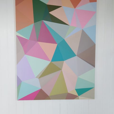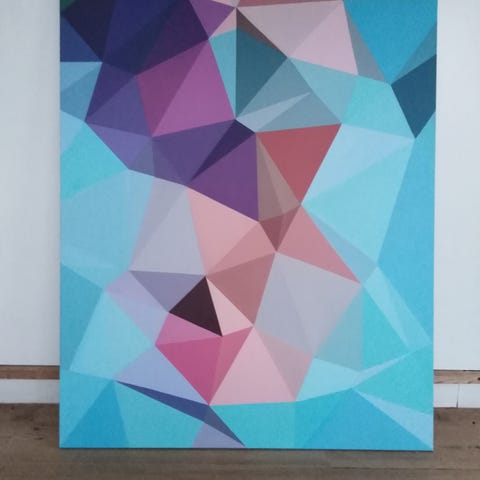 Abstrakt geometrisk maleri af Malene Hedetoft med farverige polygoner i forskellige nuancer, herunder neonpink, grøn, blå, gul og sort og kobber. MMaleriet er malet på kanten, så det ikke behøver indramning. sender gerne + fragt 250 kr. Har fravalgt fix-færdig. Tag en tur til skov og strand og kom forbi og se på maleriet. 23918466