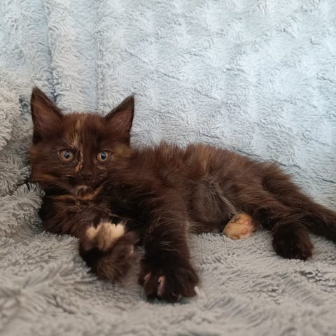 Moren er ren Maine Coon med stamtavle, faren er naboens gårdkat. Det er store, sunde og fine killinger med tufser på ørene og en smuk blød og blank pels.