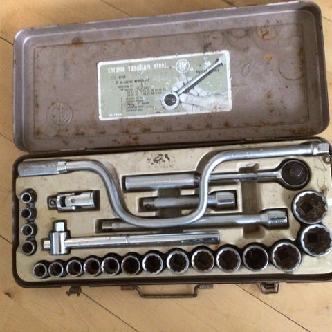 Topnøglesæt med forskellige størrelser hylstre og to skraldenøgler i et sort plastik etui. Sættet indeholder metalværktøj og opbevaringskasse med håndtag for nem transport og opbevaring.