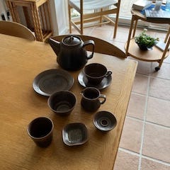 Stentøj, Te-stel, Knabstrup, 6 personers te-stel med side tallerkener, stort kagefad og sukkerskål, 2.sortering som nyt uden skår.