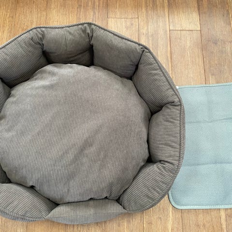 Ollipet hundeseng i khaki kordfløjl med polstret kant og rund form. Sengen har en blød pude i midten og en skridsikker bund i sort materiale. Velegnet til små til mellemstore hunde.