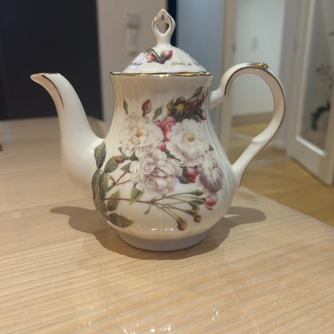 Royal Winton Grimwades tekande sæt i grøn farve med dekorative blomsterdetaljer. Sættet indeholder tekande, kopper, underkopper, flødekande og sukkerskål. Fremstillet i porcelæn.