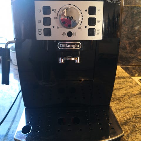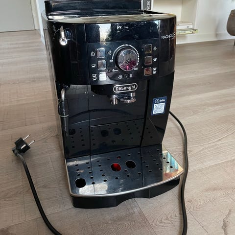 DeLonghi Magnifica S espressomaskine i sort farve. Maskinen har et kontrolpanel med knapper og drejeknap til justering af indstillinger. Den er udstyret med en mælkeskummer og drypbakke i rustfrit stål. Velegnet til brygning af espresso og kaffe med mulighed for skumning af mælk.