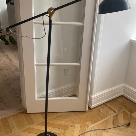 Stilren standerlampe i grå metal med industrielt udtryk. Lampeskærmen kan vippes, så lyset nemt kan rettes i den ønskede retning. Perfekt som læselampe, stemningsbelysning eller til kontor/stue.