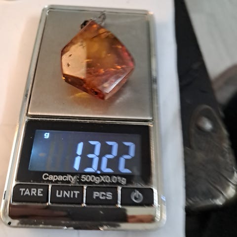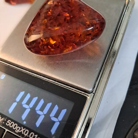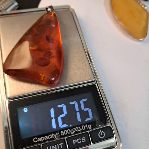 Vedhæng, rav, En stor antik gylden ravvedhæng med sølv CL og vejer 25g.