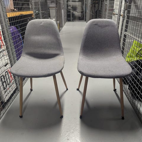 Sæt med 2 moderne spisebordsstole i mørkeblåt stof med ben i træ. Stolene har god siddekomfort og et enkelt, nordisk design, der passer til de fleste spiseborde.