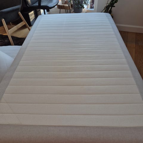 Få pletter der vil kunne fjernes på selve sengen, men topmadras er helt ren. Pris er inkl. ben og velholdt topmadras!