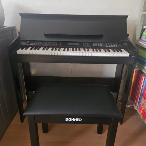 Ringway TG-8810 digitalt klaver i sort farve. Klaveret har et komplet tastatur og leveres med en matchende sort bænk. Modellen er designet til hjemmebrug og øvning.