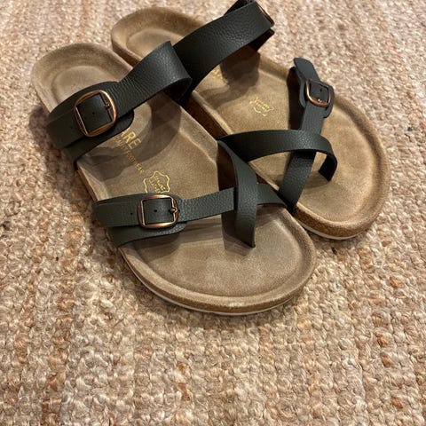 Disse sandaler er lavet af læder, hvilket giver et naturligt look. De har to brede remme over foden og en justerbar hælrem med spænde for at sikre en god pasform. Sandalerne har en korksål, som giver extra komfort ved brug. De er ideelle til subtropiske klimaer og let anvendelse som sommercasual fodtøj.