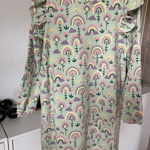 Mørkeblå regnbuekjole. Brugt en del, og krympet lidt i vask, så den svarer ca. til str. 5 - 6 år / str. 110 - 116 nu.