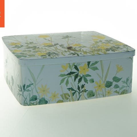En metalæske med et sejlskibsmotiv på låget. Æsken har en rød farve med slide mærker og en vintage stil. På siden står 'BLUE BIRD' Confectionery, Made in England. Æskens størrelse er 20,5x17 cm med en flad form der gør den egnet til opbevaring af små genstande.