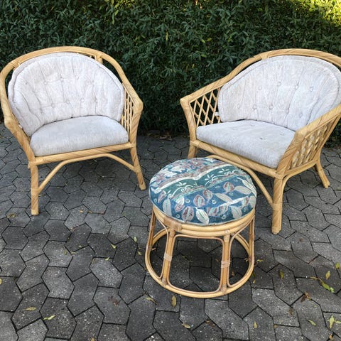 Komplet sæt udestuemøbler med hynder og matchende puder. 3 pers. sofa, 2 enkelt stole, stort sofabord, 2 sideborde, lille bord med avisholder. Fremstillet i Indien af sukkerrør og hjembragt for ca 10 år siden. Kan leveres fra Orø eller fra Brøndby