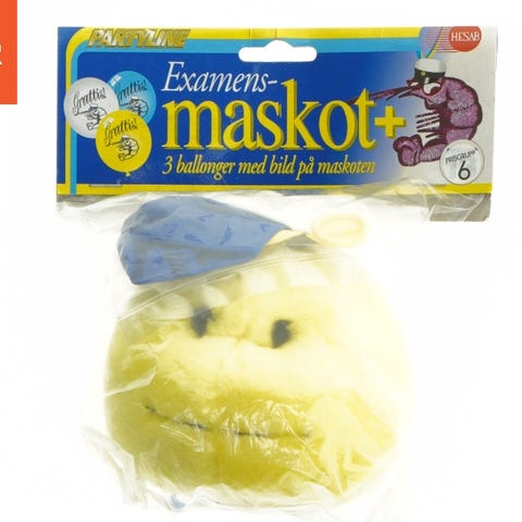 Denne pakke indeholder en eksamensmaskot med tre balloner. Maskoten er designet til at fejre eksamen og inkluderer detaljer såsom illustrationer på ballonerne. Pakken er stadig forseglet, hvilket indikerer, at produktet ikke er blevet brugt. Dimensionerne af produktet i emballagen er cirka 16x10 cm.