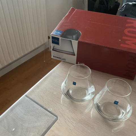 Dette er et sæt bestående af 6 romglas fra Lyngby Glas. Glassene har en moderne og stilfuld form med en diameter på 5,5 cm og en højde på 9 cm. Glassene kommer i deres originale emballage, som viser detaljer om pleje og anvendelse.
