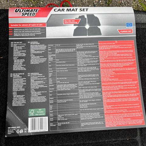Dette er et sæt bil gulvmåtter i sort farve. De er lavet af et blødt materiale og har en form, der passer til bilens gulv. Der er flere måtter, der kan dække både forreste og bagerste gulvområde af bilen.