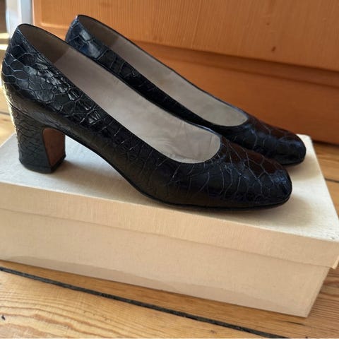 Et par hvid slangeskinds sko med hæl. Skoene har en unik bølgeformet kant langs åbningen og en metalisk detalje på tåen. Størrelsen af skoene er 36. Undersiden viser tegn på slid.