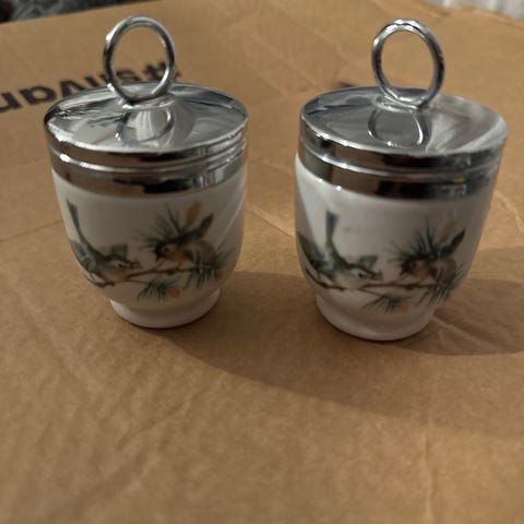 Dette er et sæt bestående af to hvide opbevaringsskåle lavet af keramik, hvor hver skål har et tilhørende låg lavet af lyst træ. Den større skål har en diameter på 13 cm, mens den mindre skål har en diameter på 10.5 cm. Begge skåle har flade bunde, hvilket gør dem stabile til placering på forskellige overflader. De trædæksler sidder godt fast og giver skålene et naturligt og moderne look.