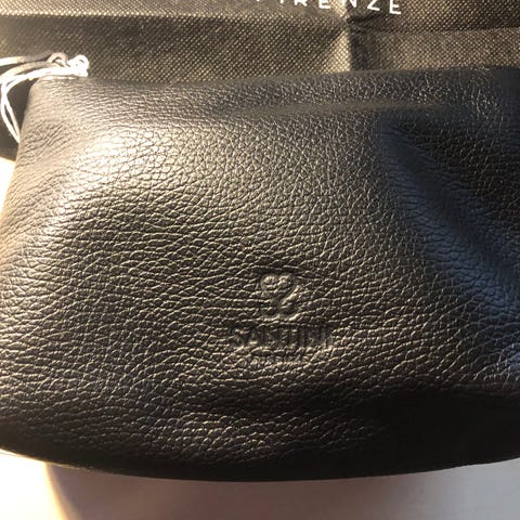 En elegant hvid clutch taske med en prægning, der ligner strudsehud. Tasken har en flaplukning med en gylden knaplås dekoreret med 'Via Veneta'. Tasken måler 23 x 17,5 cm, perfekt til at bære essentielle småting. Den har en neutral farvetone, der gør den alsidig til forskellige outfits og lejligheder.