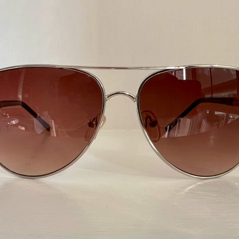 Disse solbriller har en klassisk aviator design med en slank metalramme og mørke linser. Brillerne har justerbare næsepuder for ekstra komfort og den samlede bredde på brillen er 14,5 cm. De sorte stænger har en elegant kurve og giver en stabil pasform bag ørerne.