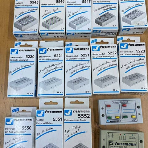 Viessmann modeltog tilbehør med forskellige modeller og typer, herunder baneskilte, andrekryds og signaler.