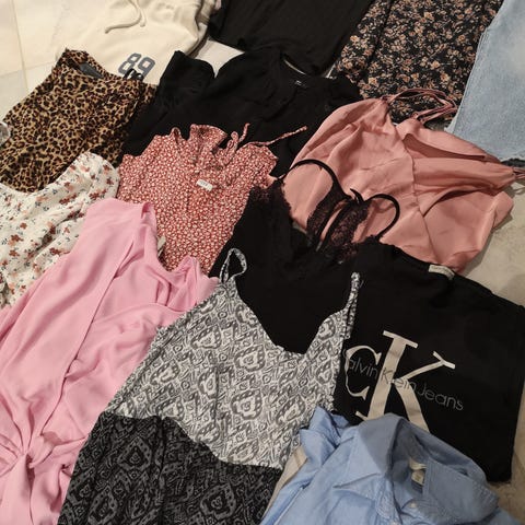 Tøjpakke str. M - selv om der står L i noget af tøjet, er det meget småt og skriver derfor M. Samt har jeg sat smykker og bælter til som matcher tøjet. Kun noget af tøjet er brugt få gange, men andet har aldrig været i brug.