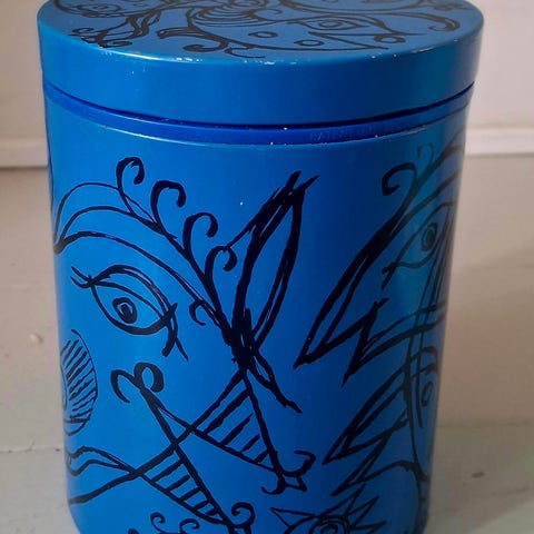 Denne beholder er cylindrisk og har en farverig dekoration med malede motiver af mennesker og huse. Det robuste låg har yderligere malerier af blomster og en kvinde. Beholderen måler Ø 11,5 cm og længde 15 cm, hvilket gør den velegnet til opbevaring af små genstande eller varer. Overfladen har et kunstnerisk, nostalgisk udseende, ideelt til dem, der værdsætter vintage stil.